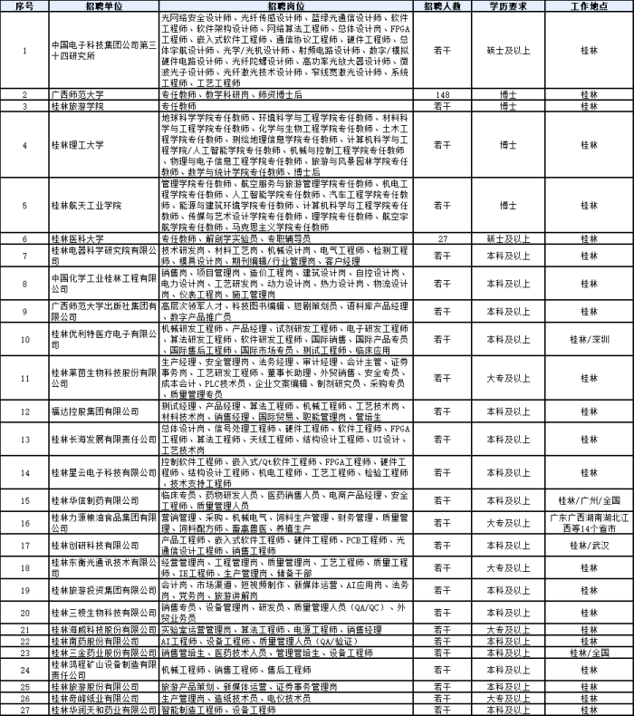 本次招聘会由30家桂林企事业单位组团赴汉举办,参与单位涵盖高校、科研院所,以及新一代信息技术与人工智能、先进装备制造、新材料、生物医药、生态健康食品、旅游文创等重点产业领域骨干企业,招聘需求超1200人。活动以最优岗位供给、最厚政策支持、最佳服务保障,诚邀江城英才走进桂林、选择桂林、扎根桂林,共赴发展新征程。